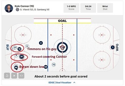 A follow up to the Defensive positioning. Before the goal was scored, you can see Timmons stay with his guy, Bryam went to the boards (as a D-man could/should rather than a forward deep in the zone) and Benson (or was it Norris? I thought Benson but this says it was Norris) 'kinda' picks up the front of the net. In the next screenshot, Timmons is still with his guy (he played that exactly as he should). Byram was out of the play because he was circling back, but thats fine because he was coming back from the boards. Until Byram circles back, the Forward was covering the front of the net/Connon and he NEEDS to keep doing that. It was Benson who lost his guy. This one is not at all on the D-men. They did their job. Forward coverage made them look bad for all that are blaming Timmons/Byram. -