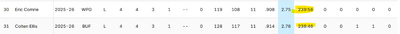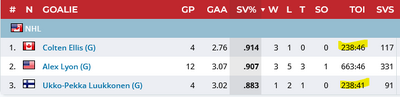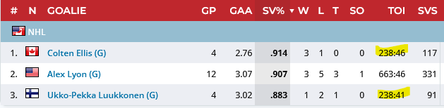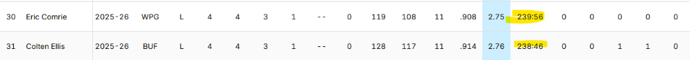 Also interesting that comparing GAA, he is just behind our friend Eric Comrie, and he's also played virtually the same amount of minutes. Rank Name Team GP W L SA Sv GA Sv% GAA TOI 30 Eric Comrie WPG 4 3 1 119 108 11 .908 2.75 239:56 31 Colten Ellis BUF 4 3 1 128 117 11 .914 2.76 238:46