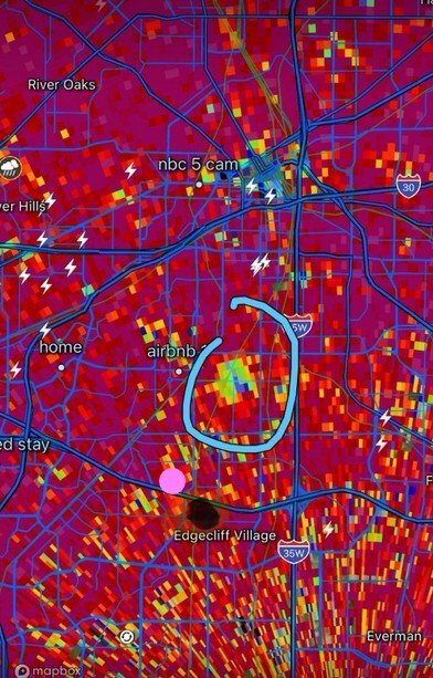 So just after the game ended, a thunderstorm blew through. We lost power for a few minutes, then it came back on. While it was out the wind was really blowing and swirling. Apparently there was a tornado (circled in blue) less then three miles from our house (pink dot). The direction the storm has been moving could have placed it right over our house as it was forming.