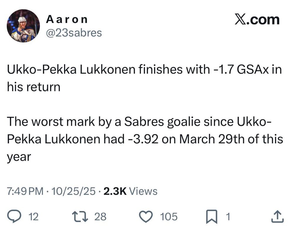 The road to the buyout is starting right now. If UPL loses his starting job, he is toast and the money his agent would get is as well. If UPL was to stay down in Rochester for the full 2 weeks and Ellis lights it up, it would likely be light out for UPL. And as you said, UPL has no trade value. There’s really one possibility if UPL doesn’t have a role in the Sabres goalie rotation going forward.