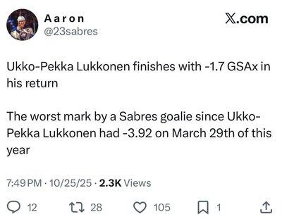 Frustrated at the final result. On the other hand, being able to get the loser point might be a sign distinguishing this team from prior years when the team would freeze and the momentum would swing to other team snatching a win from us. I thought that the Sabres had the slight edge in play. But as @Taro T pointed out if the Toronto shooters were more accurate hitting the target this would have a been a different game. One big positive was the play of Tage. I liked the play of Timmons. He’s a no frills solid defenseman. Quinn is getting better and playing with more grit and speed. How can someone not like how Benson plays? In a couple of years when he is more physically developed he is going to be a gem. The Toronto player who stood out to me was McCabe. He was the toughest player in the game. The loss was disappointing but getting 3 points in a back to back is a positive.
