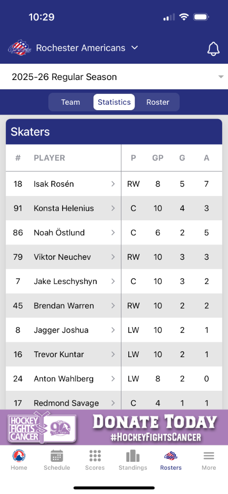 Preview of tonight’s game: https://www.amerks.com/news/detail/game-preview-amerks-fight-crunch-for-top-spot-in-north-division Something that caught my eye from the preview, “After three straight seasons finishing in the bottom six of the league for penalty minutes, the Amerks enter this week leading the Eastern Conference with 165 through 10 games. A pair of defensemen are accountable for nearly a third of those PIM, with Nikita Novikov (26) and Vsevolod Komarov (25) dealing out punishment.”
