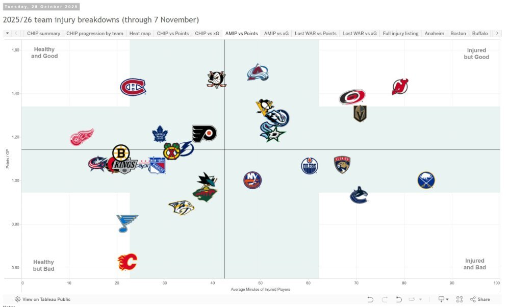 And this is likely to get worse as the next few games go on..... NHL Injury Viz: 2025/26 team injury breakdowns (through 7 November) -
