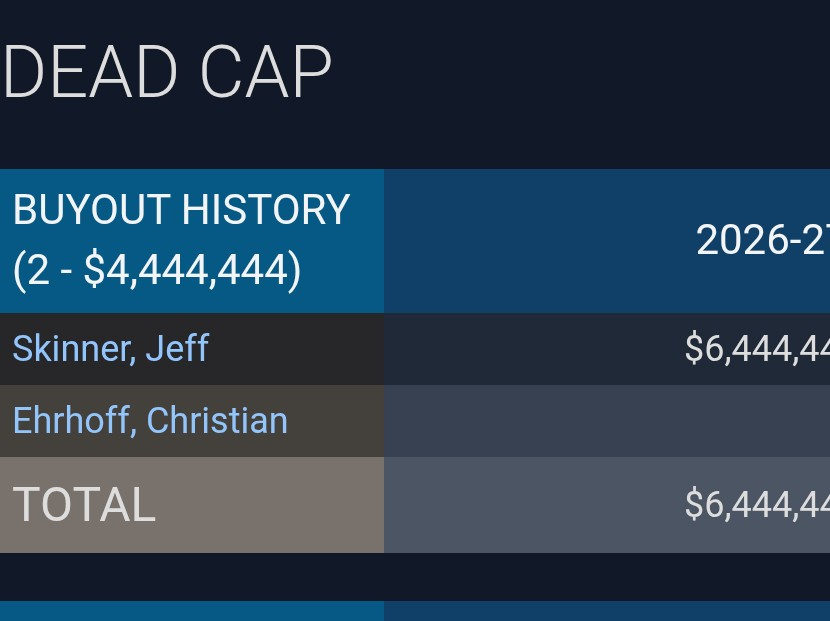 Everything I see shows Skinner's numbers accelerating next year to 6.44..for one year. I got my numbers from cap wages also.... I looked just that next year. That also doesn't include Tuchs current contract. Unless their data is incorrect... But I don't think it is because they've had those numbers out for quite some time now. I'll double check when I have a chance later... But my initial post about this a couple days ago was partially in response to another person who came up with the same numbers I did.