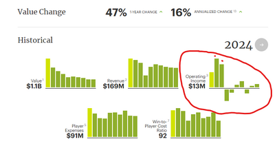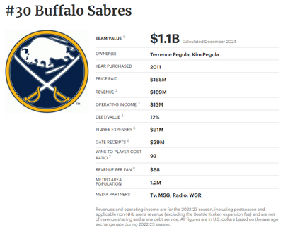 2. lol - it is like you folks have never heard of Google. Forbes does all this work for you. This is from 2022-23, but feast thine eyes: Red circle, operating income - 2024 was $13M, 2023 was $25M, and 2022 was $22M The fine print in the first part implies that the $13M is after payroll, taxes, and arena expenses. It also notes, that is NOT inclusive of the Kraken fee ... which was $1B/30 so ... $30M per team. The Sabres have not lost money since Covid. Pleez Stahp!!!!