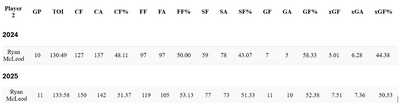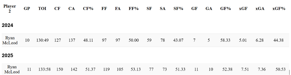 GDT: Sabres @ Bruins, 7:00pm Oct. 30, 2025, π πΊ ESPN+/MSGBroken Ankles replied to LGR4GM's topic in The Aud Club Below is a snippet of McLeod for just October 2024 vs 2025 - 5v5. Eleven games vs. ten, but a higher XGF, and a higher XGF%. More Shots for and SF% is better. Actual Goals against is 2X (concerning?), but GF is ~60% more. My observation is they are driving play.
