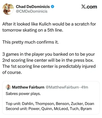 I would prefer Kulich to wing and Quinn to the press box. It might be like shifting chairs on the Titanic, but Quinn has been INVISIBLE. He’s averaged about 16 min a night so far and this is his stat line: Zero points, 2 SOG (9 SOG against), zero hits, 2 shot blocks, 3 giveaways. But sure Lindy, punish the kid instead of the guy cashing checks at 3.375MM -