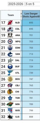 This could be part of the problem... Possibly in the other end as well. The Sabres still give up a fair number of low danger shots. Keeping shots to low danger tells me the D are doing their jobs by keeping pucks to the outside. But giving the other team the opportunity to be in our zone enough to take that many shots might be more on the our F's not maintaining possession in the attacking zone. (More cool colours.)