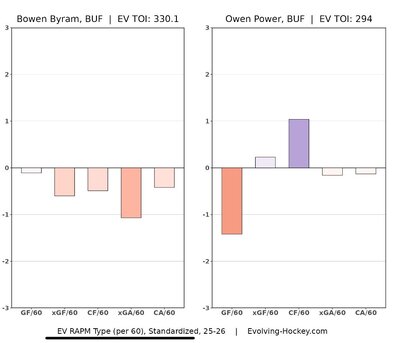 Here is the Evolving Hockey comparisons Neither one truly separates themselves. Although Power and Kesselring did look really good together in a very small sample size. Power is cost controlled for a longer period of time as Byram is an UFA at the end of his current contract I would still move Byram if I choose between the two -