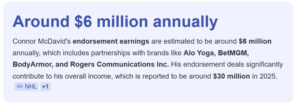 A quick search with results from sportrac claims McDavid makes/made $6m per year in endorsements, Matthews $5m